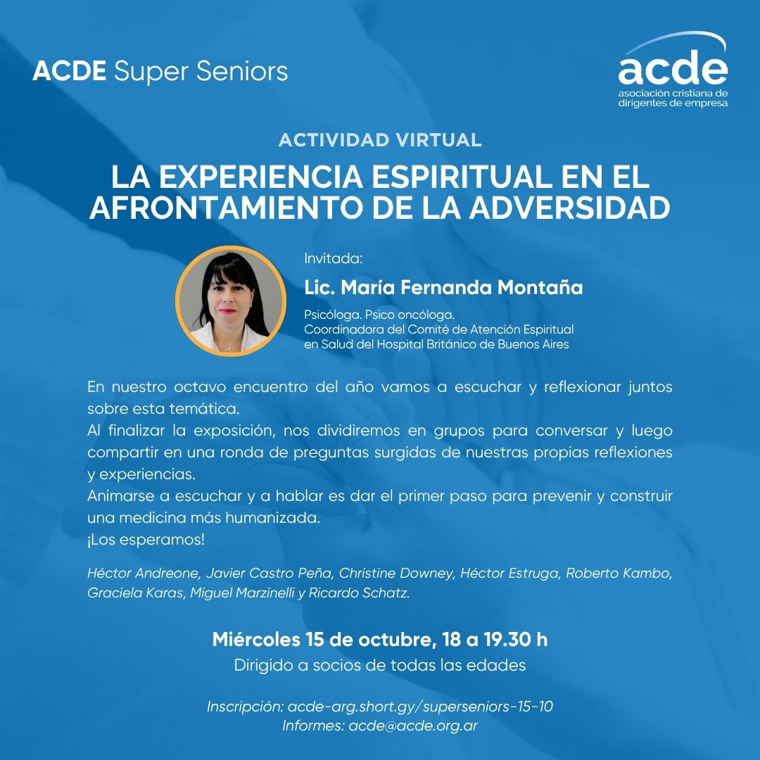 Te invitamos a participar de la próxima actividad de Super Seniors el miércoles 15 de octubre de 18 a 19.30 h por Zoom. Vamos a escuchar y a reflexionar juntos sobre cómo transitar la adversidad desde la espiritualidad.